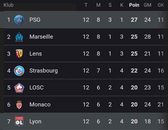 Posisi Klasemen Sementara Liga Prancis (Ligue 1)